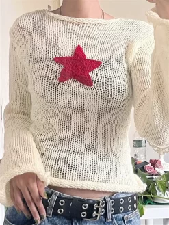 Women Knitted Tops Long Sleeve Crew Neck Star Pattern Sweater Y2K Aesthetic Clothes Gothic Grunge Autumn Shirts Streetwear