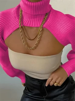Fashion Women Extr-short Sweater Long Sleeve Mock Neck Knit Tops Fall Winter Shrug Knitwear