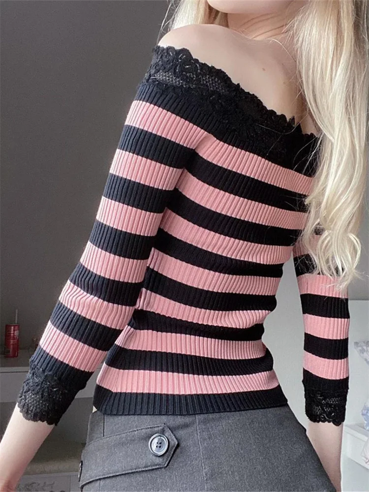 Women Long Sleeve Shirt Striped Off-Shoulder Tops Casual Pullover for Fall Club Streetwear Aesthetic Clothes